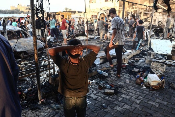A Palestinian boy gestures as people check the destruction following an Israeli army strike around tents for displaced people inside the walls of Al-Aqsa Martyrs Hospital in Deir Al-Balah on Oct. 14, 2024. (AFP)