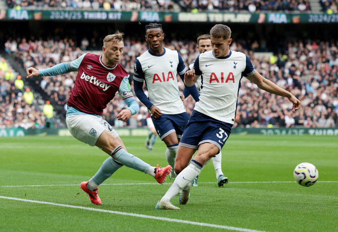 West Ham lost the ball while on the attack and James Maddison surged forward to feed Kulusevski, whose shot came off the goalkeeper’s hand and the inside of both posts.