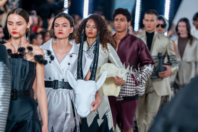 A particular highlight was ArAm by Arwa Al-Ammari, whose fashion show was a celebration of Saudi Arabia's wildlife. The collection was inspired by the country’s rich natural heritage, focusing on animals that are seldom seen, such as the oryx, the Arabian leopard, the Arabian wolf, and the Arabian bustard. In addition to these creatures, the collection drew aesthetic influences from indigenous plants like sider (Ziziphus spina), arar (Juniper), arak (Salvadora Persica), sheh (Artemisia), sant (Acacia), gada (Haloxylon Persicum), and athoba (Senegalia Mellifera).