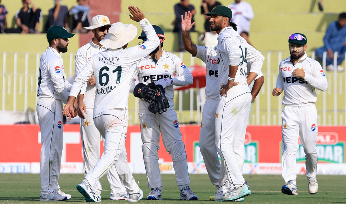 Pakistan’s Zahid Mahmood celebrates with teammates after taking the wicket of England’s Jamie Smith, caught out by Mohammad Rizwan during the third Test between England and Pakistan at the Rawalpindi Cricket Stadium in Rawalpindi on October 24, 2024. (REUTERS)