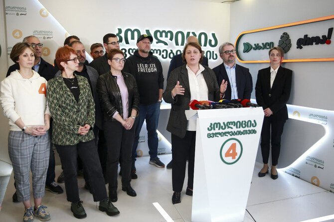 Elene Khoshtaria, chair of United National Movement, speaks to the media at the coalition's headquarters after the parliamentary election in Tbilisi, Georgia, early Sunday, Oct. 27, 2024. (AP)