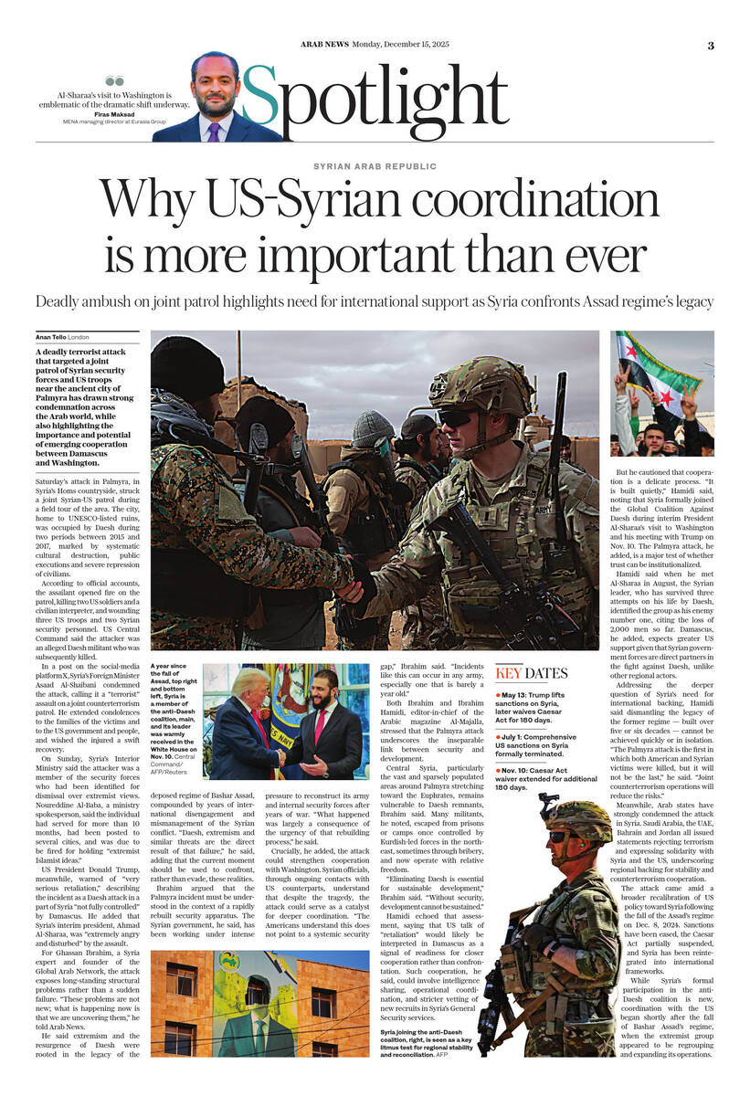 LONDON: A deadly terrorist attack that targeted a joint patrol of Syrian security forces and US troops near the ancient city of Palmyra has drawn strong condemnation across the Arab world, while also highlighting the importance and potential of emerging cooperation between Damascus and Washington.