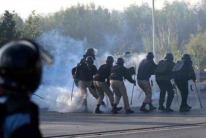 The violence erupted at the end of a march led by Khan’s wife Bushra Bibi and his key aide Ali Amin Gandapur that arrived in Islamabad early on Tuesday.