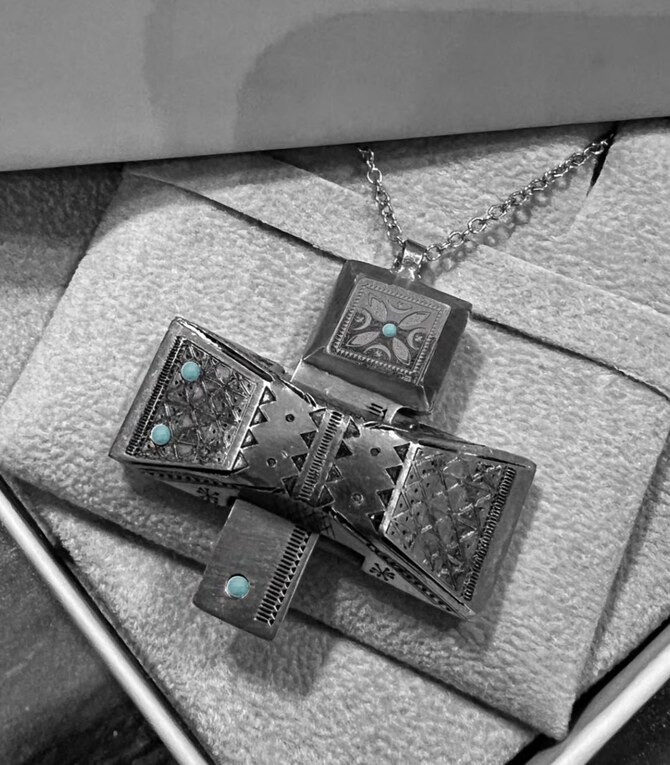 The souvenirs are a necklace in the shape of a lock and a brooch that serves as a key with a design inspired by the iconic Najdi doors, known for their geometric patterns and colors.