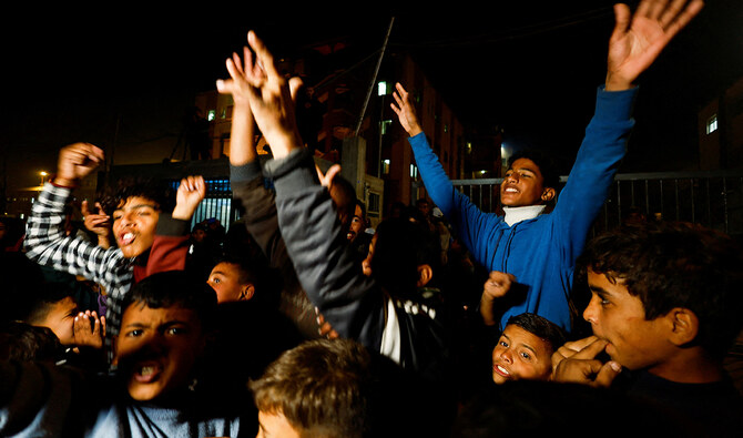 Palestinians celebrate the announcement of a ceasefire deal between Hamas and Israel in Deir Al-Balah, central Gaza Strip on January 15, 2025. (AP)