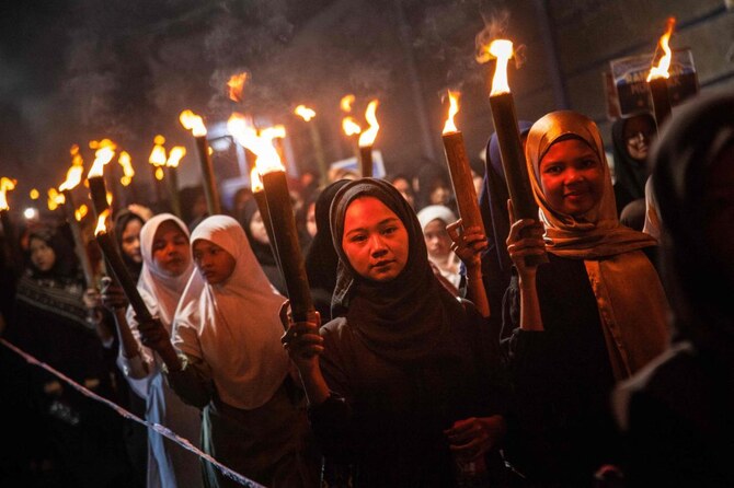 They carried torches, lit flares and played Islamic songs accompanied by the beat of rebana, the Arabic handheld percussion instrument, as they walked along the cramped streets of the densely populated neighborhood.