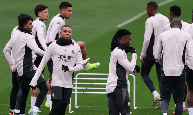 Real Madrid’s French forward Kylian Mbappe (C,L) and teammates attend a training session on the eve of the UEFA Champions League Round of 16 first leg between Real Madrid CF and Club Atletico de Madrid at Real Madrid Sports City in Valdebebas, on the outskirts of Madrid, on March 3, 2025. (AFP)