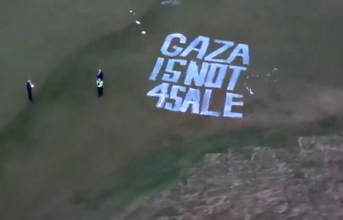Local media on Saturday showed images of red paint scrawled across walls at the course with the slogans “Free Gaza” and “Free Palestine” as well as insults against Trump.