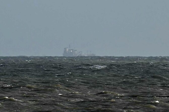 The Stena Immaculate tanker that collided with Solong container vessel appear at a distance off the coast of Withernsea, east of England, on Mar. 11, 2025. (AFP)