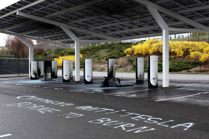 SAINT-ÉTIENNE, France: Twelve Tesla electric superchargers were targeted in an arson attack in the carpark of a supermarket in central France, a police source told AFP on Sunday.