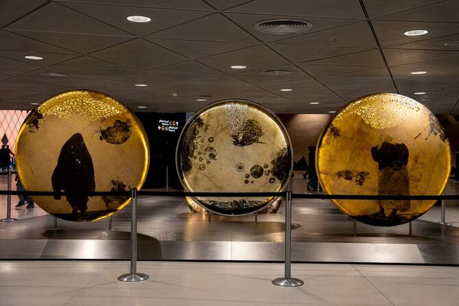 An artistic installation inside Qasr Al-Hokm Metro Station, featuring illuminated drum-like structures inspired by Saudi heritage. (AN Photo/Huda Bashatah)