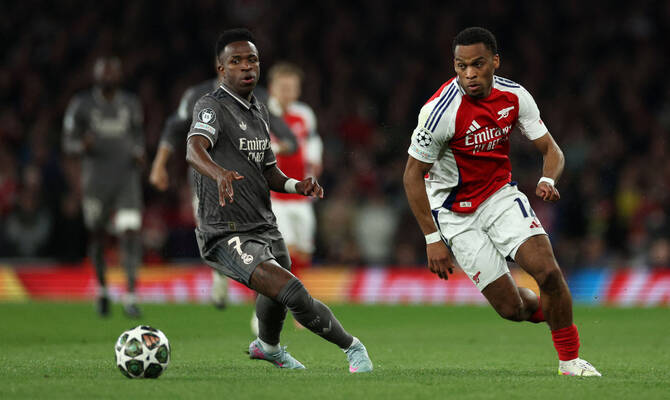 Arsenal showed no signs of being cowed by Real’s star-studded attack and Rice’s towering header from Jurrien Timber’s cross forced a fine save from Thibaut Courtois, who scrambed across to keep out Gabriel Martinelli’s effort from the rebound.