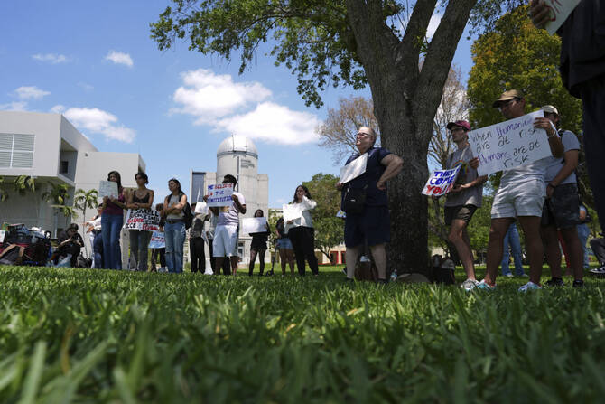 About 150 protesters rallied at Columbia, which had been the scene of huge pro-Palestinian protests last year. They gathered on a plaza outside a building that houses federal offices, holding signs emblazoned with slogans including “stop the war on universities” and “censorship is the weapon of fascists.”