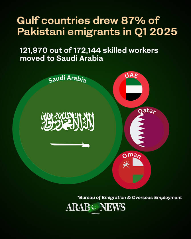 ISLAMABAD: Pakistan sent 151,120 skilled laborers to Gulf countries in the first three months of 2025, state-run media reported on Monday, with Saudi Arabia topping the list of countries where the most number of Pakistani workers went.