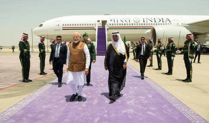 JEDDAH: Indian Prime Minister Narendra Modi was escorted by Royal Saudi Air Force F-15 fighter jets ahead of his touchdown in Jeddah on Tuesday, where he was greeted by a 21-gun salute in a ceremonial welcome that highlighted the growing defense ties between the two countries.