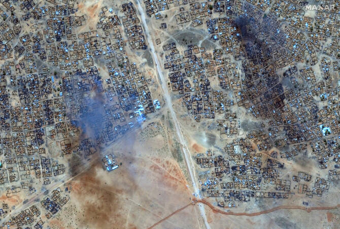 This handout image courtesy of Maxar Technologies taken on April 16, 2025 shows weapon-mounted technical vehicles on the eastern border of Zamzam camp near the besieged Darfur city of El-Fasher. (Maxar Technologies via AFP)