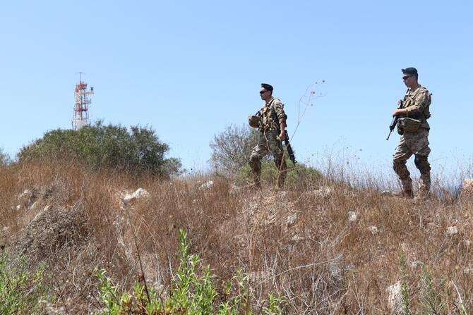 Lebanese army soldiers patrol the border area near Naqura in southern Lebanon on August 8, 2023, close to an Israeli observation tower across the border. (AFP)