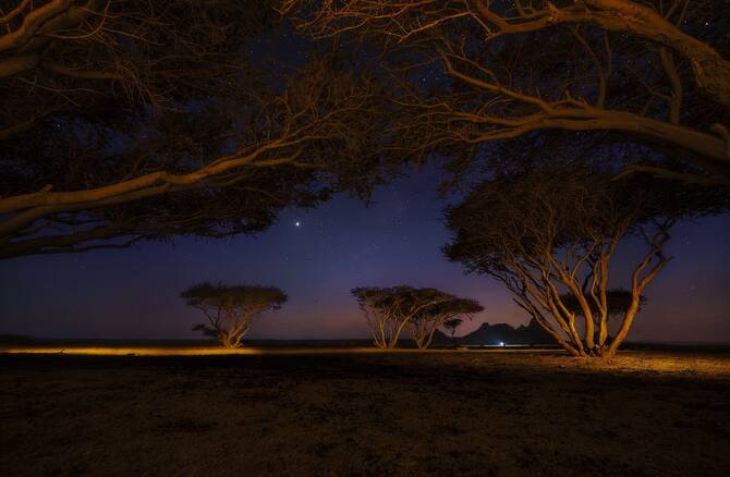 Al-Shammari’s winning image, the photographer writes in the catalogue, shows “Hasalat, located in the southwest of Qassim near Dharya, captured in a serene night where trees stand still beneath the stars.”