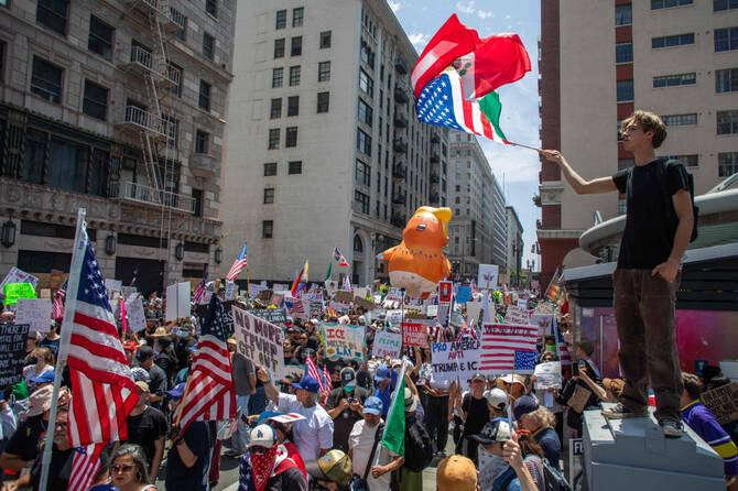 Protesters staged impromptu dance parties and, on the march, passed National Guard troops or US Marines stationed at various buildings. Most interactions were friendly, with demonstrators giving fist bumps or posing for selfies, but others chanted “shame” at the troops.