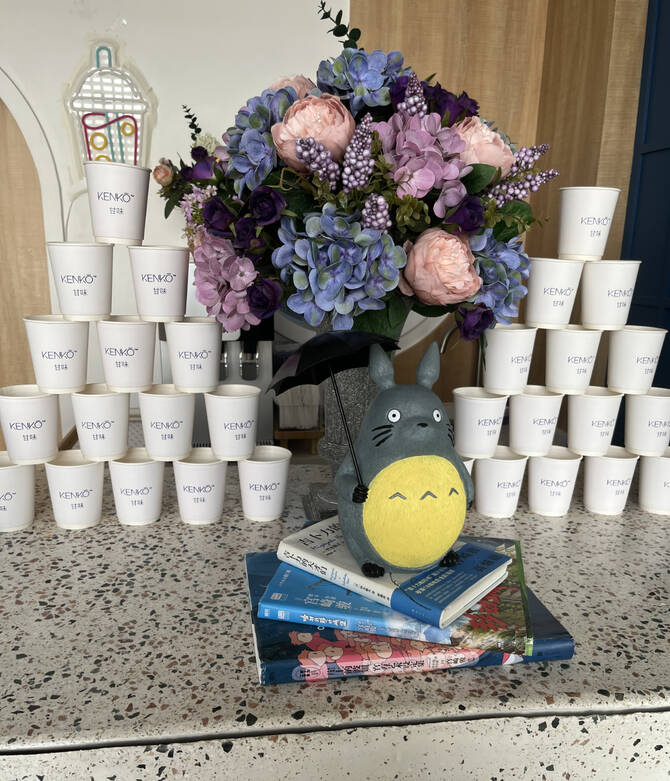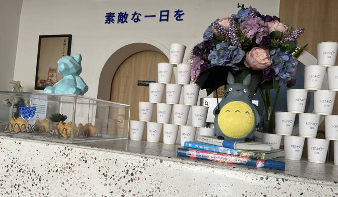 Totoro memorabilia, a few quaint trinkets and books add a distinctly Japanese touch. There is also a full-length mirror, evidently popular for selfies.