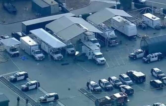 Aerial footage from KABC-TV shows the explosion happened in a parking lot filled with sheriff patrol cars and box trucks. Three covered bodies could be seen near a truck with a ramp attached to a side door. A sheriff’s patrol cruiser parked nearby had its rearview mirror shattered by the blast.