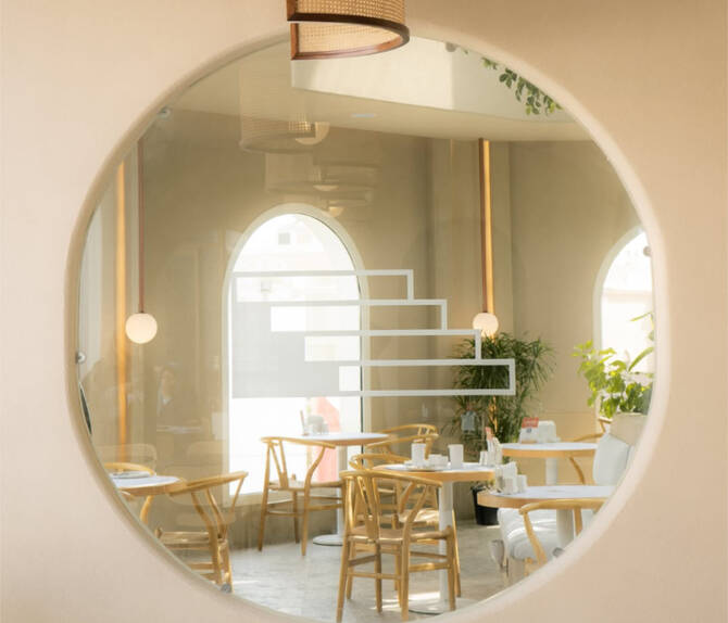 With a light beige/pink stone interior, a big tree in the middle and elevated views of the neighborhood, UPSTAIRS is a beautiful breakfast spot that guarantees a relaxed start to your day.