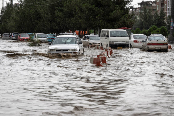 Vehicles move through a flooded road after heavy rainfall in Kabul on July 13, 2025.  (AFP)