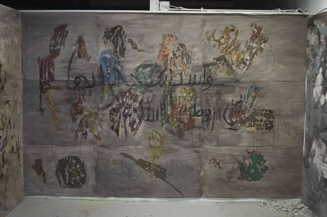 Dib created a large-scale, distressed wall installation layered with paint, Arabic text and marks that resemble remnants of protest posters.