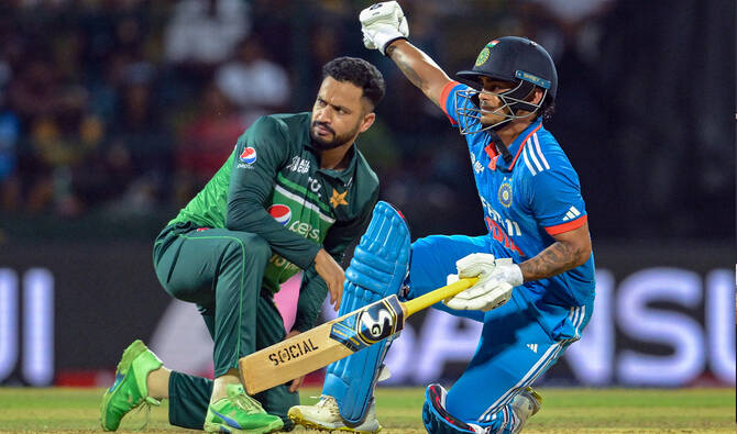 India’s Ishan Kishan (right) falls on the ground during the Asia Cup 2023 one-day international (ODI) cricket match against Pakistan at the Pallekele International Cricket Stadium in Kandy, Sri Lanka, on September 2, 2023. (Photo courtesy: AFP/File)