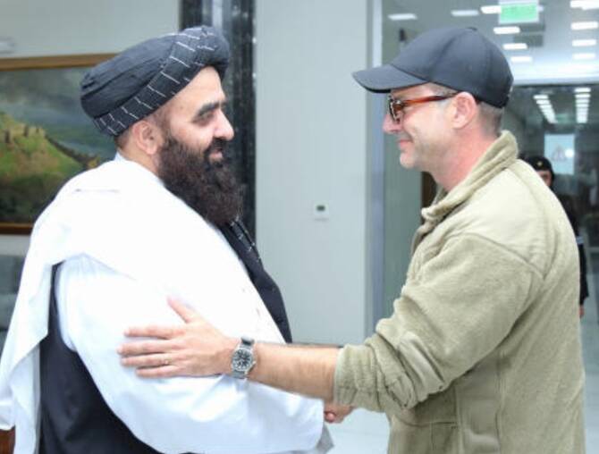 The Taliban released photographs from their talks, showing their foreign minister, Amir Khan Muttaqi, with President Donald Trump’s special envoy for hostage response, Adam Boehler.