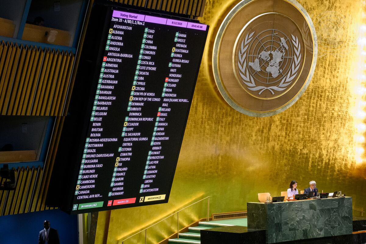 The list of nations that voted in favor of the resolution endorsing the New York Declaration is shown on screen during the UN General Assembly's 2nd plenary meeting on the Question of Palestine at the UN headquarters in New York on Sept. 12, 2025. (UN photo)