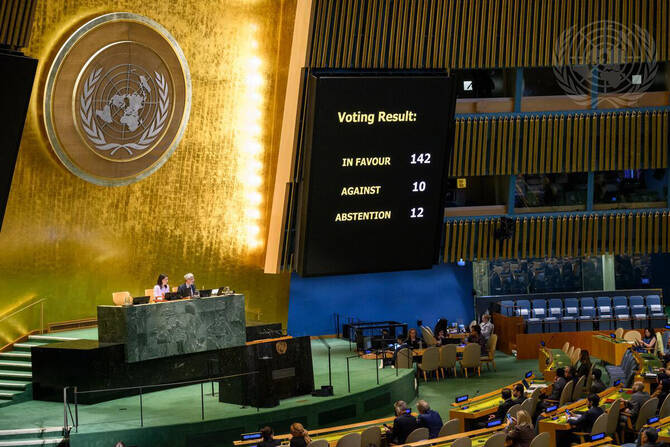 Formally known as “The New York Declaration on the Peaceful Settlement of the Question of Palestine and the Implementation of the Two-State Solution,” the resolution passed on Friday with overwhelming support, with 142 countries voting in favor. Only 10, including Israel and its key ally the US, voted against, while 12 nations abstained.
