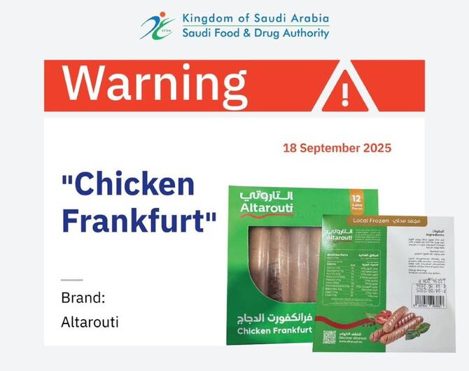 RIYADH: The Saudi Food and Drug Authority on Thursday warned consumers not to eat chicken Frankfurt sausages manufactured in the Kingdom by the Altarouti brand, after factory inspections revealed they were contaminated with potentially harmful bacteria.
