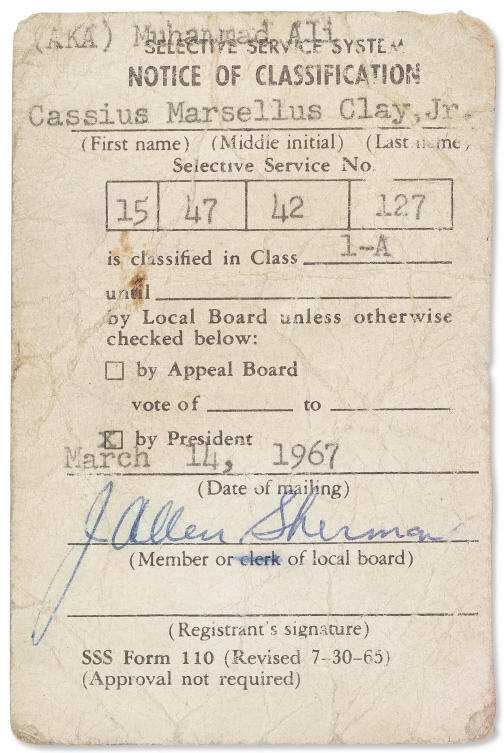 The draft card was issued the day the draft board in Louisville ordered Ali to appear for induction, Christie’s said Thursday in a news release. The card was signed by the local draft board chairman but pointedly not by Ali.