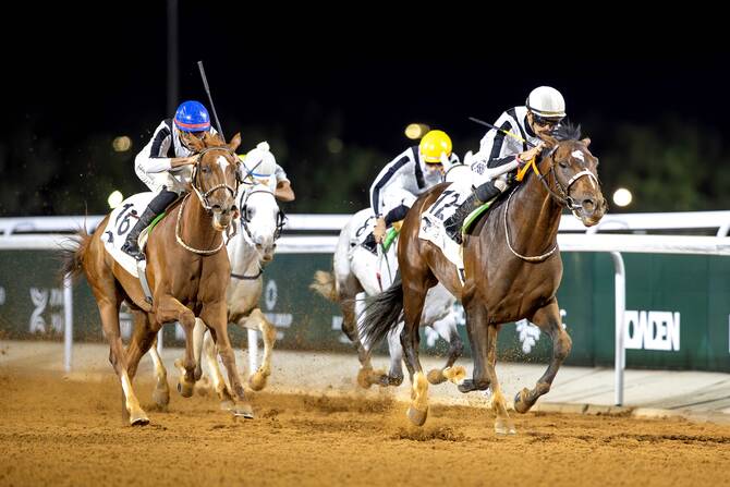 Trainer Ahmed Mohamoud’s grey sauntered into the closing stages of the 1400m event and the 2-year-old held off the same owner’s Ana Aljonubiyah (KSA) to maintain an unbeaten record by three-quarters of a length.