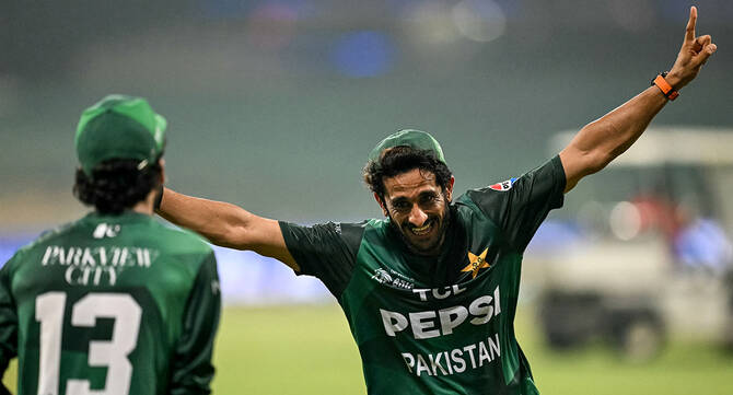Pakistan's Hasan Ali (R) celebrates his team's win at the end of the Asia Cup 2025 Super Four Twenty20 international cricket match between Pakistan and Sri Lanka at the Sheikh Zayed Cricket Stadium in Abu Dhabi on September 23, 2025. (AFP)