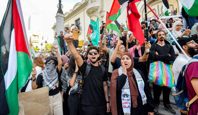 Demonstrators gather for a rally condemning Israel’s interception of the Global Sumud Flotilla outside the French Embassy in central Tunis on Saturday. (AFP)
