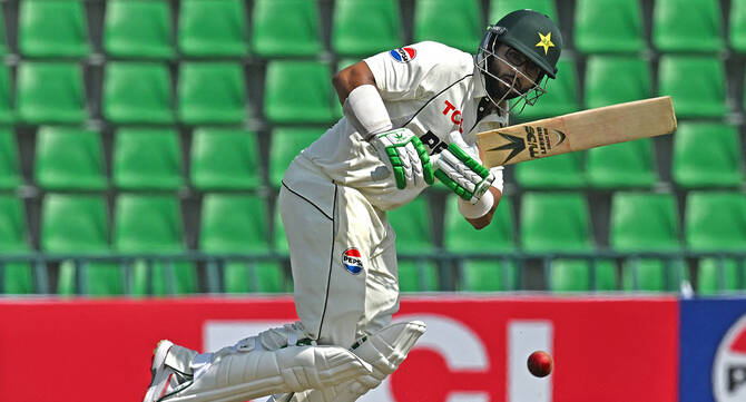 Both batters dominated the spinners with their strong sweep shots in a dominating final session for Pakistan that saw South Africa claiming the only wicket — struggling batter Babar Azam (23).