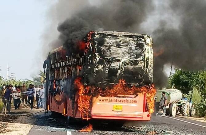 The bus was traveling from Jaisalmer to Jodhpur with 57 passengers on board when smoke emerged from the rear of the vehicle. The driver stopped the bus along the side of the road but flames engulfed the vehicle within moments, NDTV reported.