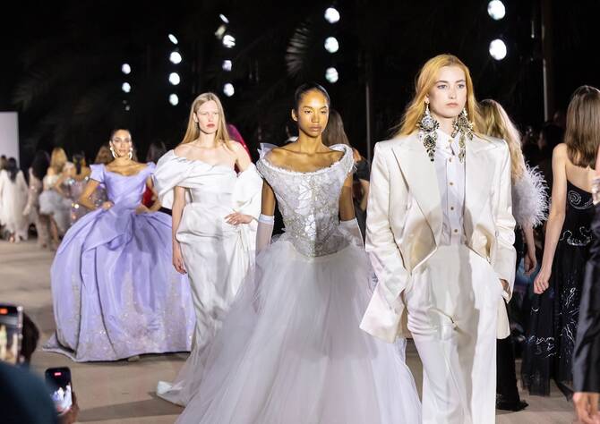 Later, an evening runway show at The Palm Grove blended British design with Saudi craftsmanship. The collection included embroidered couture gowns created in collaboration with Art of Heritage, a Saudi organization dedicated to preserving traditional craftsmanship, alongside selected looks from the house’s Spring/Summer 2026 and archival collections.