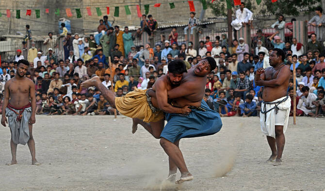 KARACHI: Two wrestlers strain and pull under the harsh glare of the sun, their feet digging into the dusty earth of the football ground. They grunt and twist, trying to unsettle the other and claim victory as hundreds watch with eager anticipation around them.