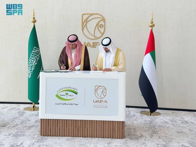 It was signed by Mazin Al-Kahmous, president of the Saudi Oversight and Anti-Corruption Authority, and Humaid Obaid Abushibs, chairman of the UAE Accountability Authority.