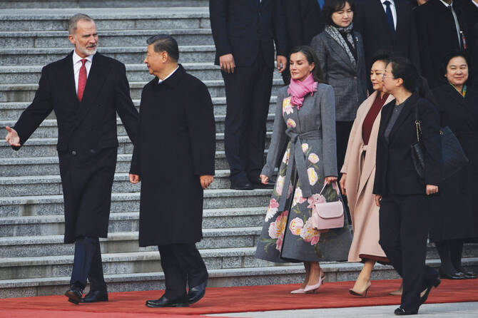 Felipe and Queen Letizia were met by Xi and his wife Peng Liyuan in front of Beijing’s Great Hall of the People, and were greeted with a performance by the military band and a 21-gun salute. This is the first state visit for the Spanish king to China, and he was also accompanied by Spanish Foreign Minister José Manuel Albares.