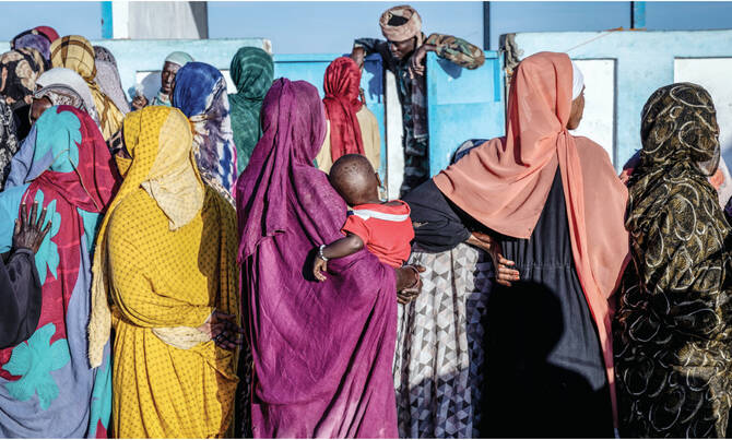 Mothers wait at a malnutrition center to register for food aid for their children in the Tiamushro camp for internally displaced persons in Kadugli, South Kordofan state, on June 17, 2024. (AFP)