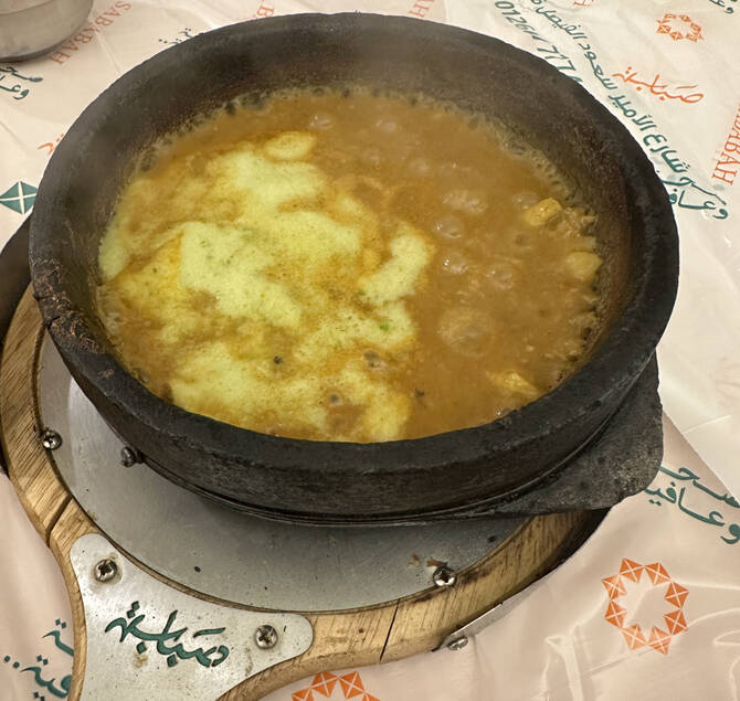 The fahsa came bubbling in an iron skillet, sending clouds of steam into the air. It was served with mulahwah, the traditional Yemeni and Jazan-style layered bread sprinkled with black sesame seeds. Its paratha-like texture pairs beautifully with sweet and savory dishes.