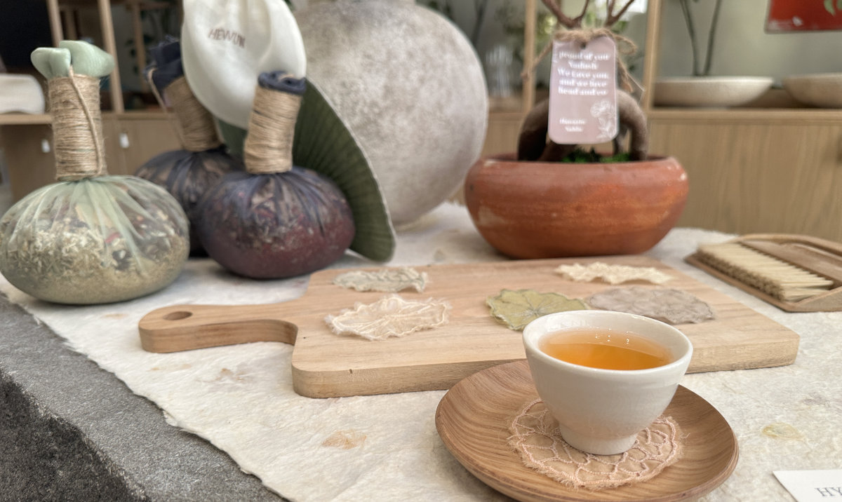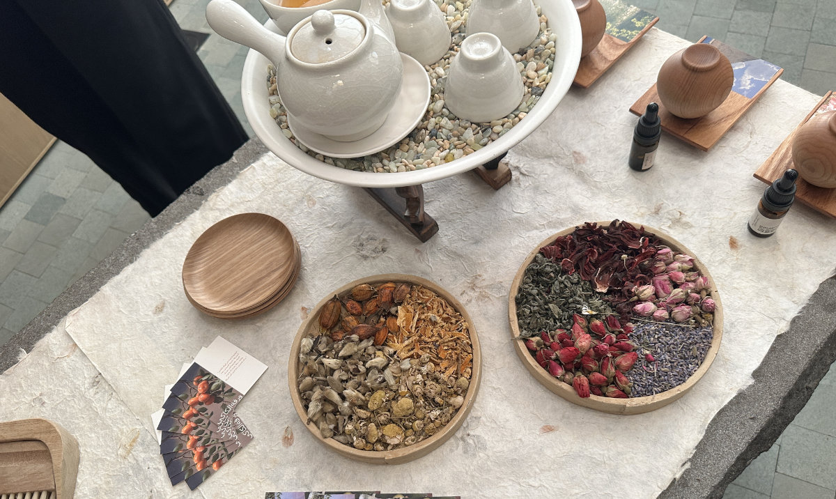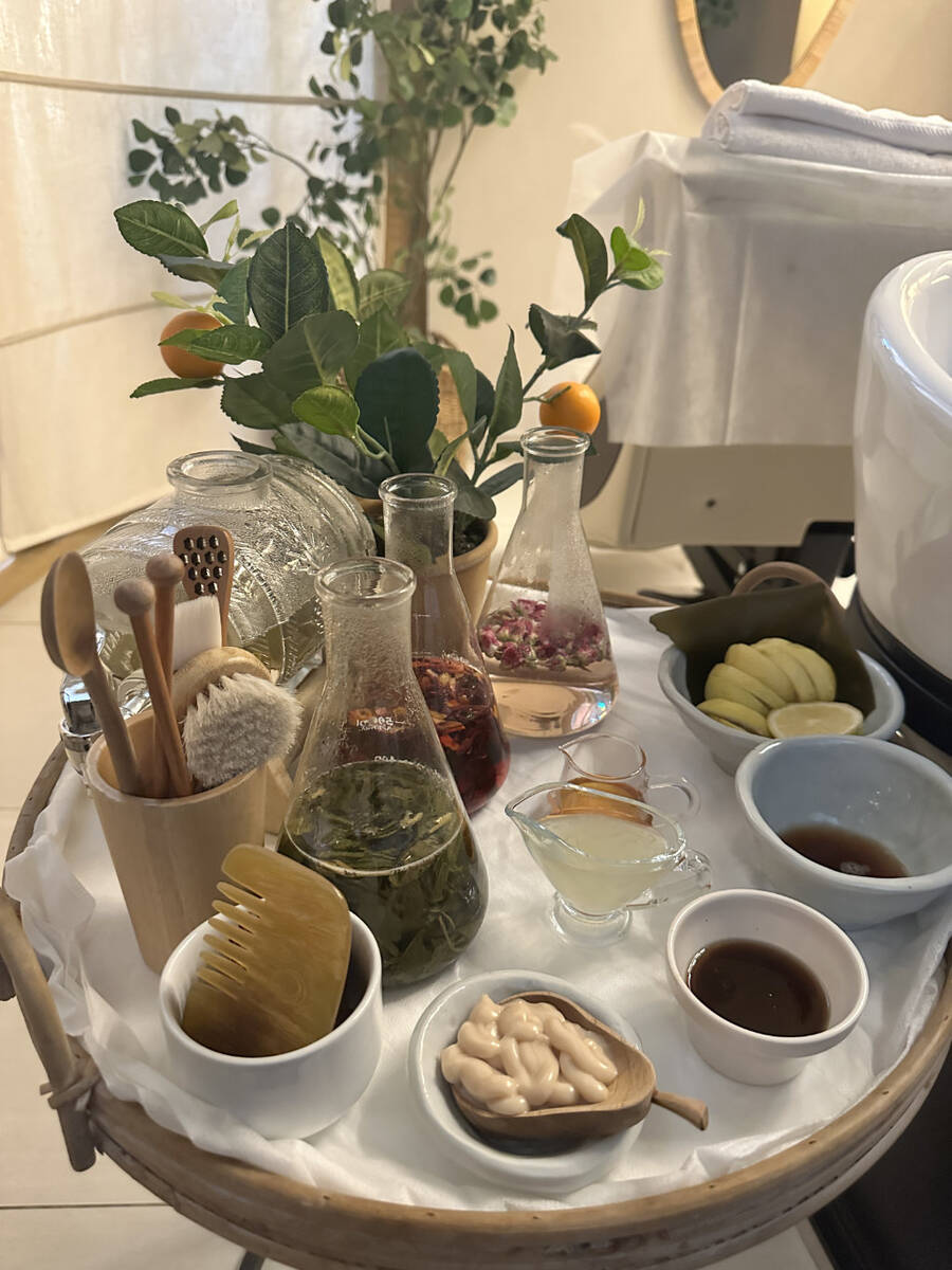 Inside the treatment room, earthy tones, ceramics, dried botanicals and minimalist decor created a soothing environment. A tray of sensory tools — wooden instruments, cups and herbal elements — was arranged like a ritual station for the experience.
