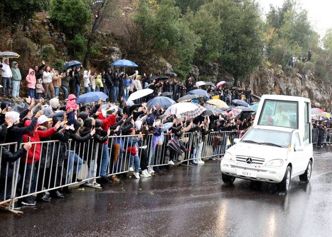 Despite the cold weather and heavy rain, thousands of people of all ages gathered from early morning to greet the pope, lining roads leading from the coastal city of Byblos to Annaya. They came from Lebanon and other countries. Security, enforced by the Lebanese army, was tight.