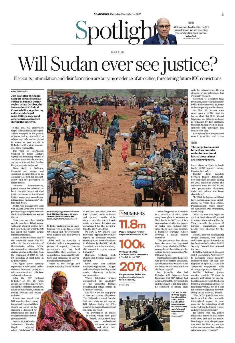 LONDON: Just days after the paramilitary Rapid Support Forces seized El-Fasher in Sudan’s Darfur region in late October, the International Criminal Court said it was gathering evidence of alleged mass killings, rapes and other abuses committed during the takeover.