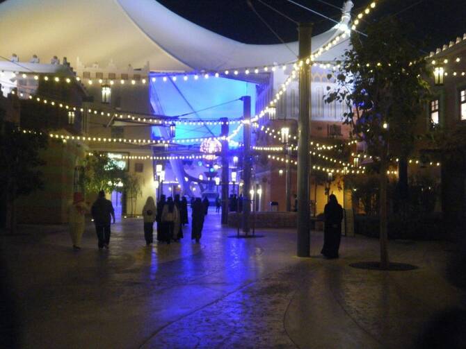 The park is brightly lit with Saudi Arabia-themed architecture. Souvenir stops and small shops are all around in traditional Najdi-style buildings.