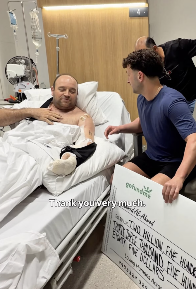 Ahmed, a Muslim father-of-two, was presented with an oversized cheque at his St. George hospital bed by Zachery Dereniowski, a social media influencer and co-organizer of the GoFundMe page, videos posted online showed.